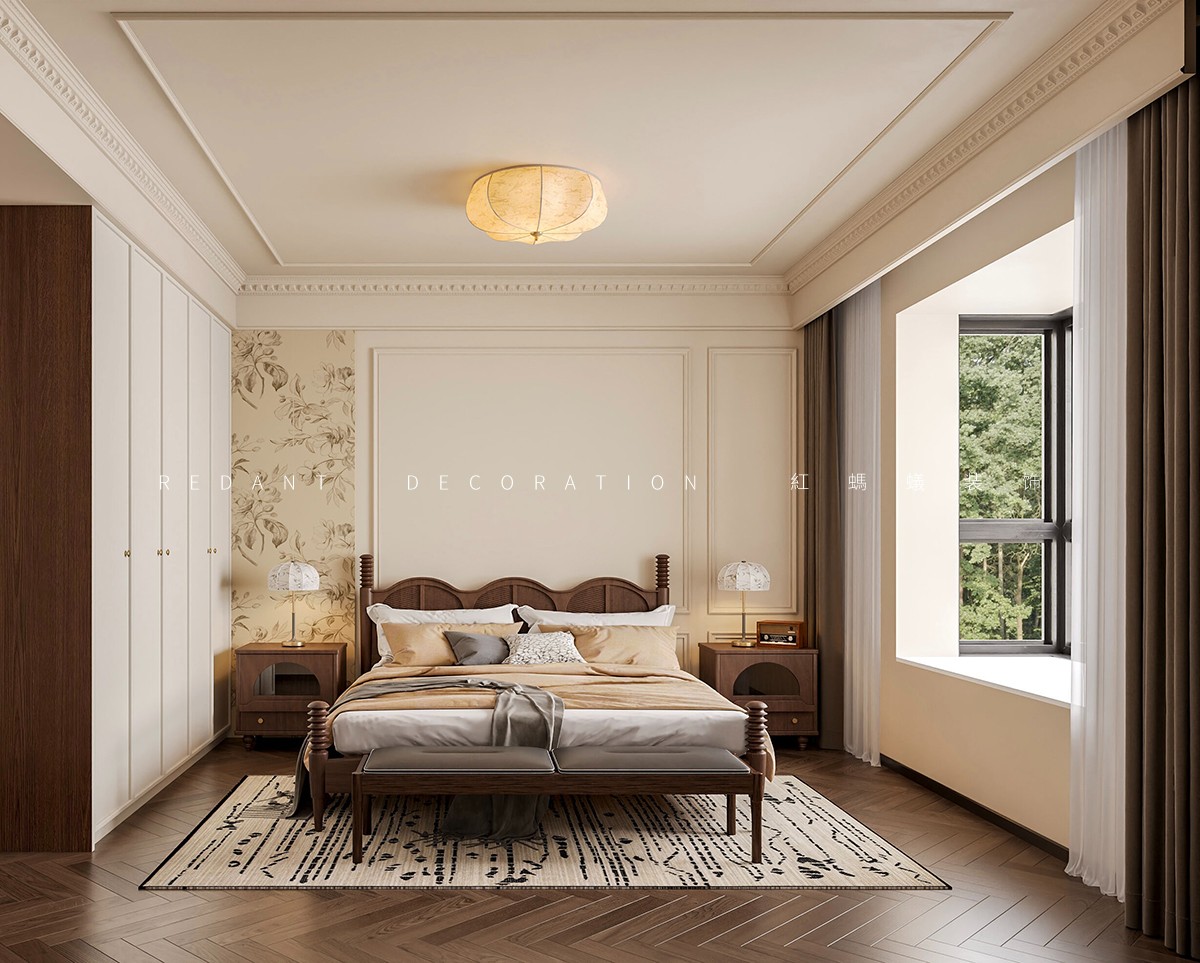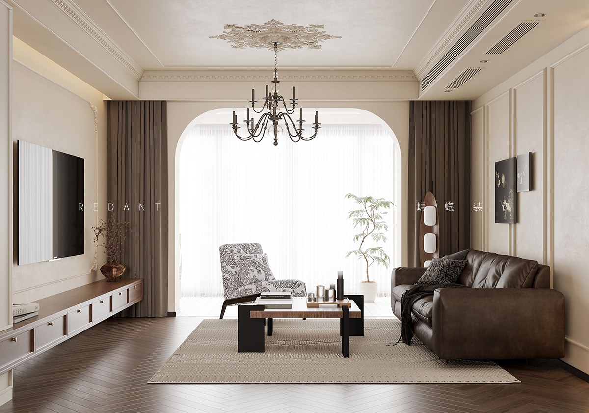 本项目以“复古新生,雅韵栖居”为核心,将法式古典美学与当代生活需求相融。空间以暖调米白为基底,深胡桃木与鱼骨拼地板奠定沉稳质感,石膏线、拱形门洞勾勒经典法式轮廓,弱化繁复雕花,彰显克制优雅。