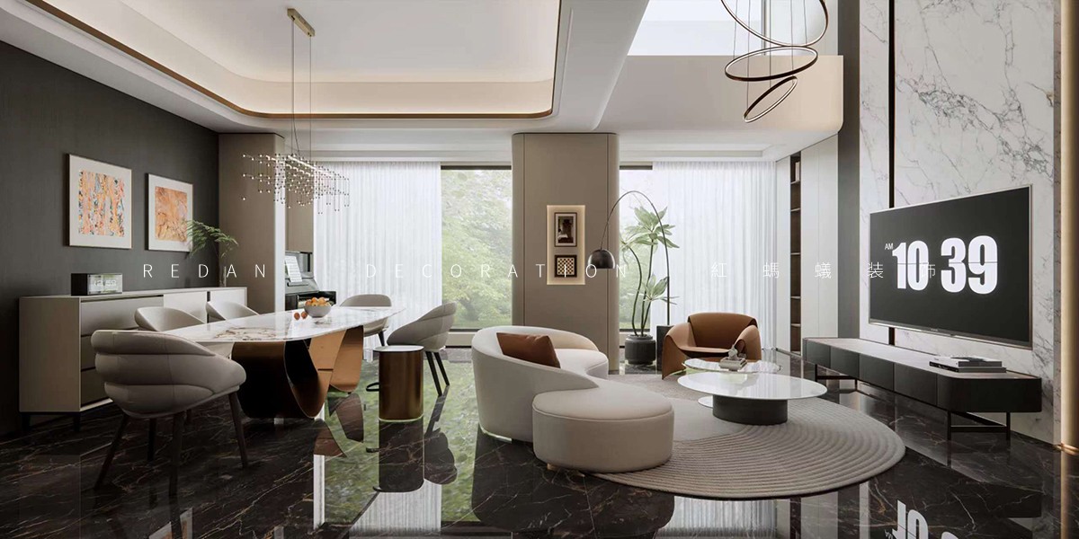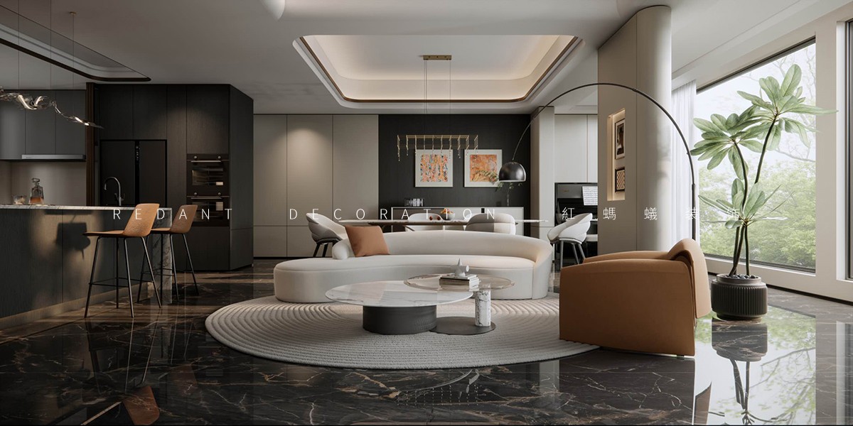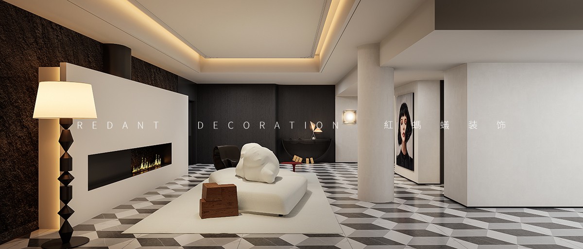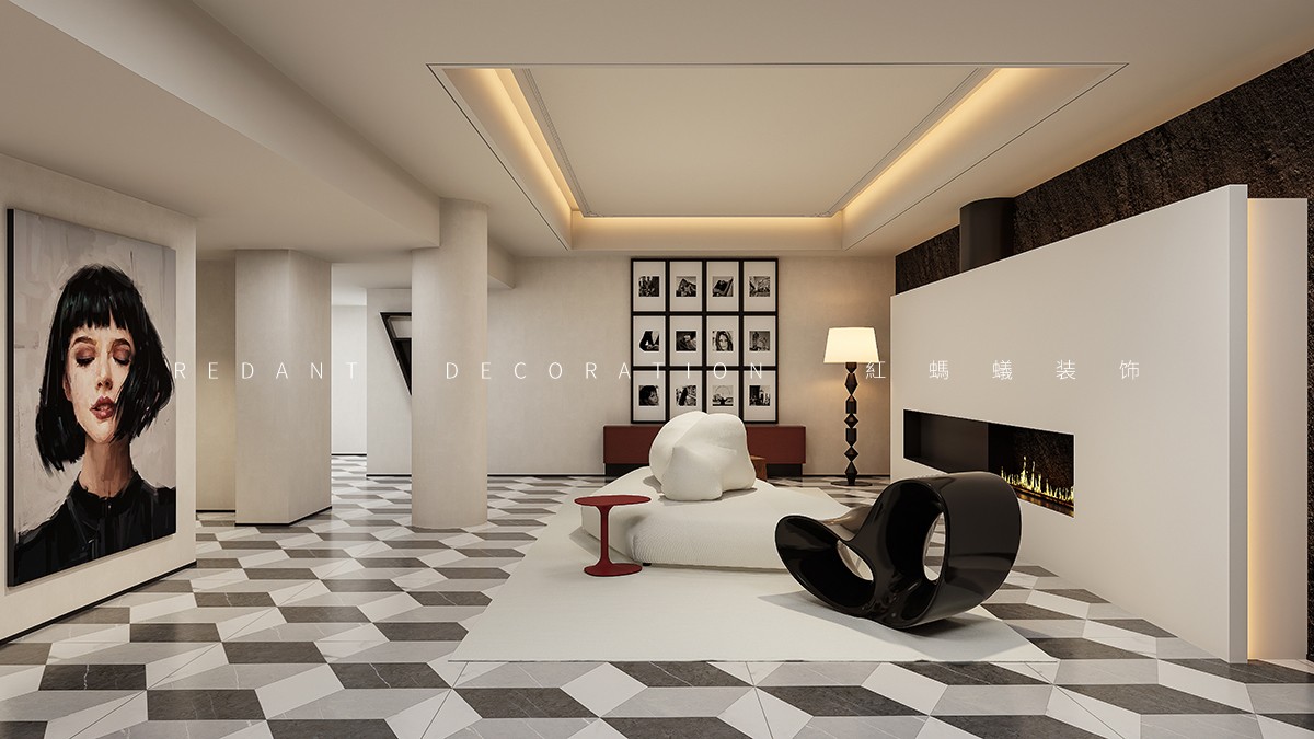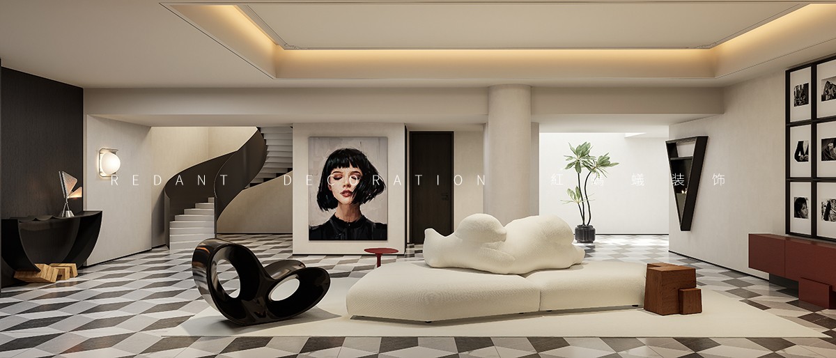 本户型为多层结构,设计充分利用空间层次,融合现代艺术美学与实用功能,完成了精准且富有格调的功能分区与优化。从各空间效果图可见,负一层打造为艺术休闲核心区,黑白灰几何拼花地砖奠定先锋时尚的基调,造型灵动的异形沙发与艺术雕塑相互呼应,搭配大幅人物肖像画与嵌入式壁炉,既为家人提供了沉浸式的休闲放松场所,也成为彰显审美品位的艺术展厅;同时旋转楼梯的设计,让负一层与上层空间的衔接更具仪式感。一层聚焦核心生活功能,以高奢质感为设计主线,通铺黑金大理石地面搭配金属线条勾勒,将客厅、餐厅与中西厨纳入开放式布局,超大采光窗引入充沛自然绿意,打破了深色系的沉闷感,完美适配家庭聚餐、亲友闲谈等多元社交场景,营造出大气雅致又充满烟火气的公共氛围。