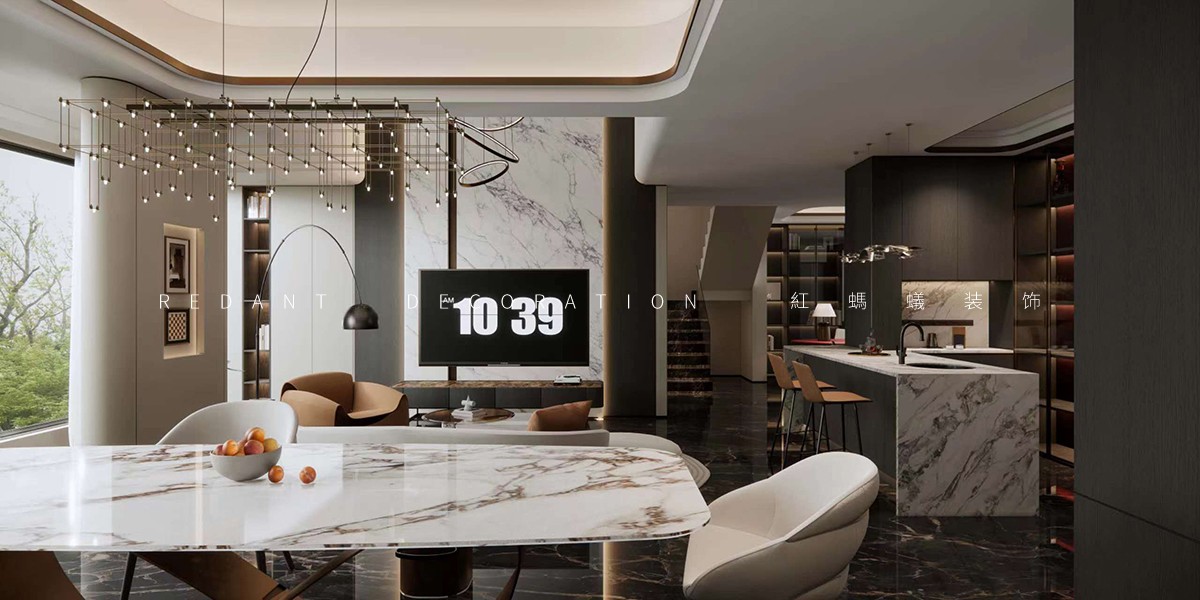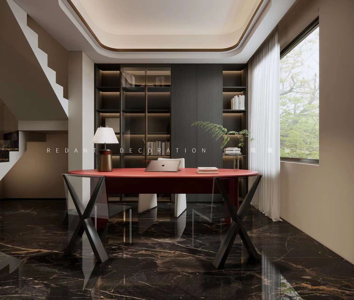 书房紧邻生活区,红黑撞色的书桌与玻璃柜体形成视觉焦点,在保证办公专注度的同时,延续了整体空间的奢华质感。在动线规划上,通过对楼梯等垂直交通空间及各功能区域水平连接部分的精心设计,让业主在艺术休闲区、生活社交区与静谧办公区之间的切换更加顺畅自然,极大减少空间转换的割裂感,显著提升居住便捷性。此外,合理的空间布局结合多层次的灯光设计,既优化了室内采光与通风条件,又通过光影变化强化了空间的艺术层次,全方位营造出兼具美学价值与宜居属性的生活空间,大幅提升整体居住品质。