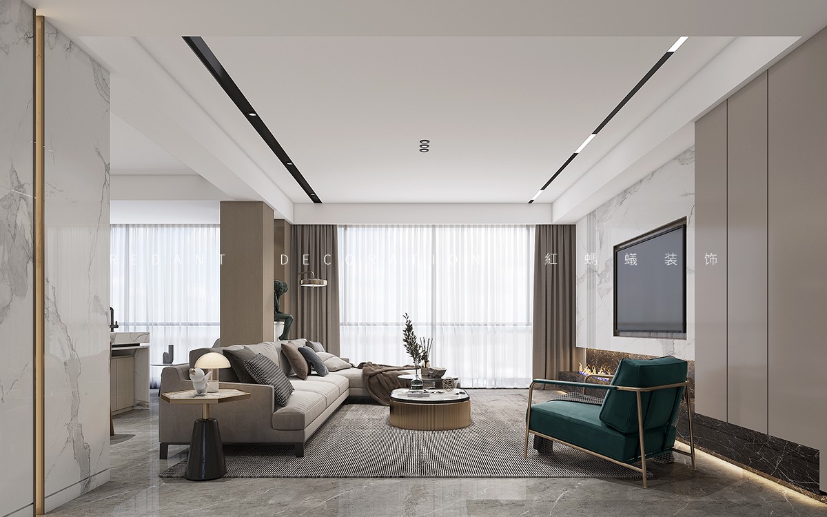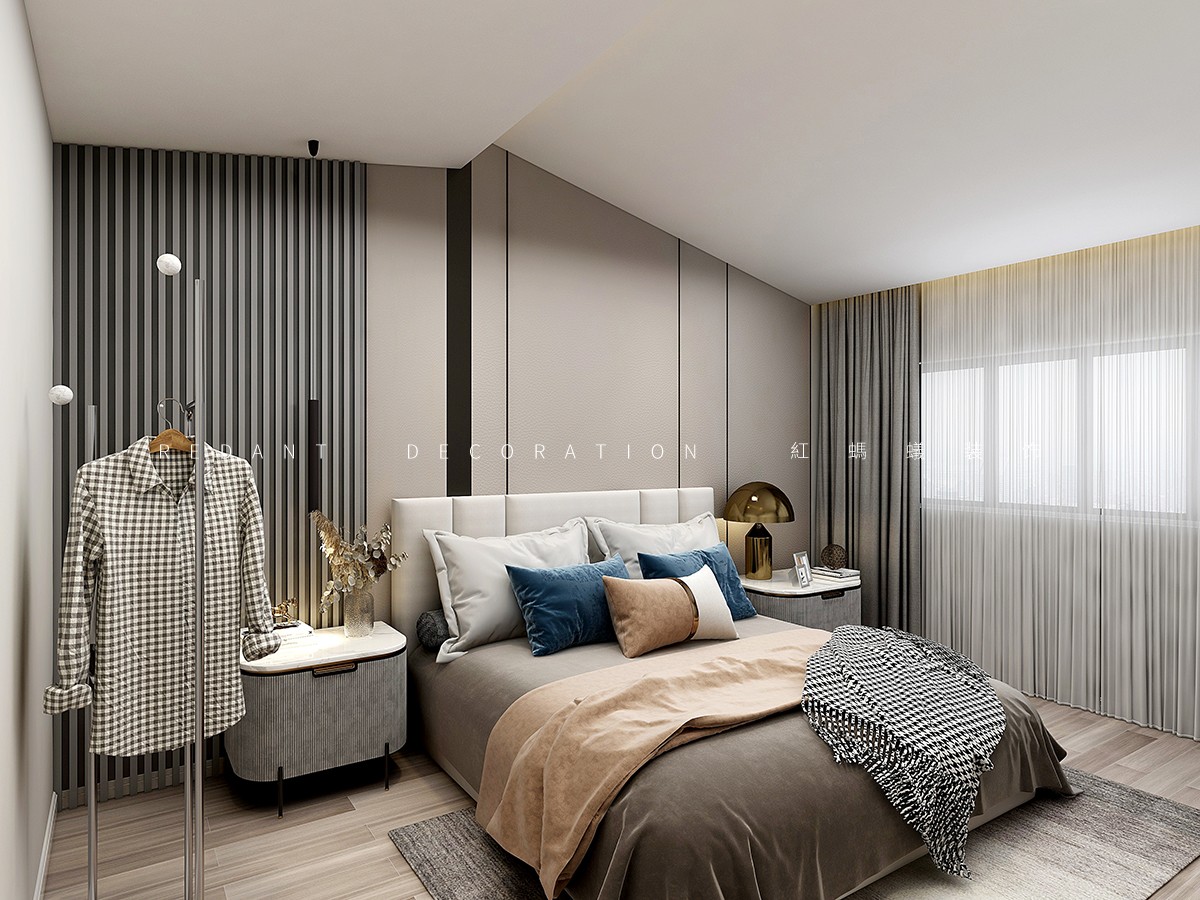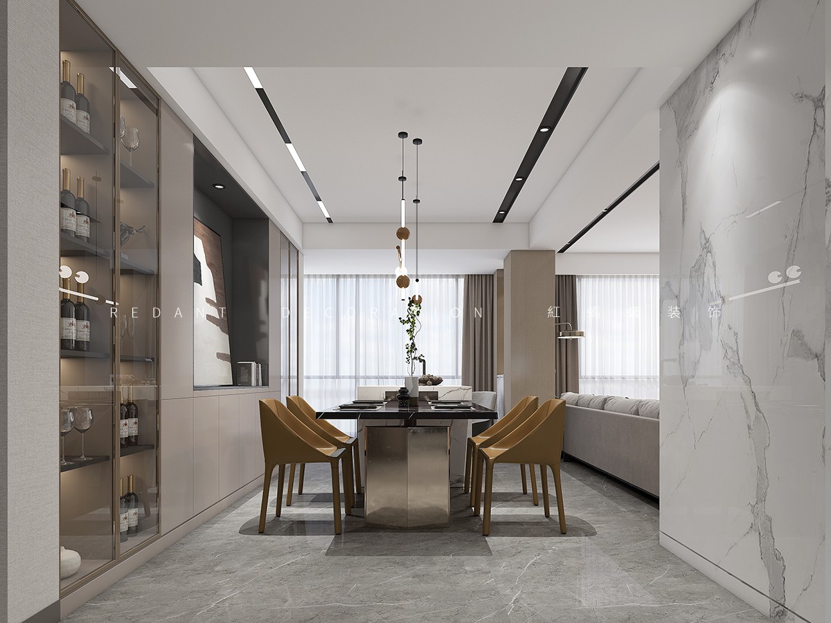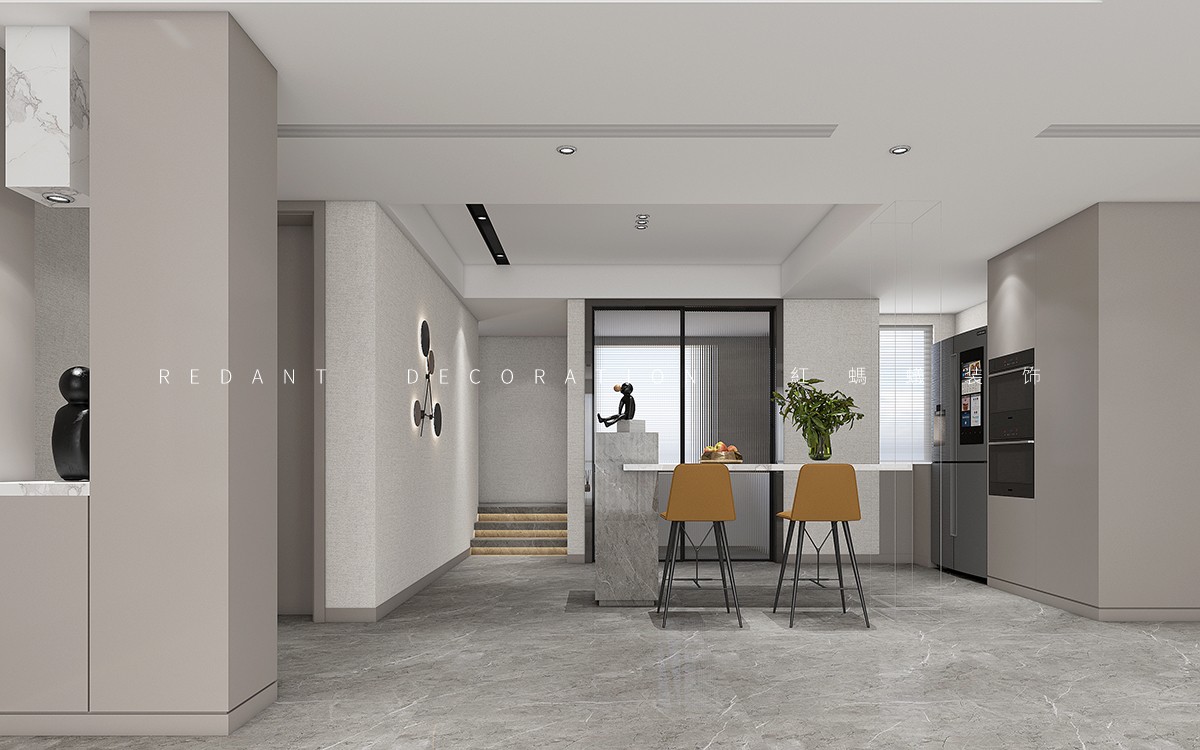 结构上,我们打开了一楼的一个卫生间和一个卧室空间。把其中一个卧室改造成餐厅空间,增加餐厅和客厅的空间互动。原始餐厅改造成西厨空间,减少原有小厨房的功能压力。同时让西厨、客厅、餐厅形成一个大的活动区。同时大量采用多通道及窗透设计,增加空间的互动性。楼梯位于公共楼梯上方,一个很大的楼梯空间没法利用,我们借用一部分楼梯空间,改造成儿童滑梯空间。增加空间的趣味性。二楼整体卫斜坡顶面,部分高低偏低,我们结合原始坡度,增加局部的层次,让二楼的层高得到大大提升。墙面大面积暖色系材质,木饰面及石材的运用。增加空间品质的同时,空间也不会觉得冰冷,营造一个温馨舒适的住家环境。