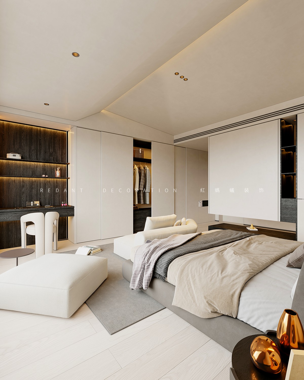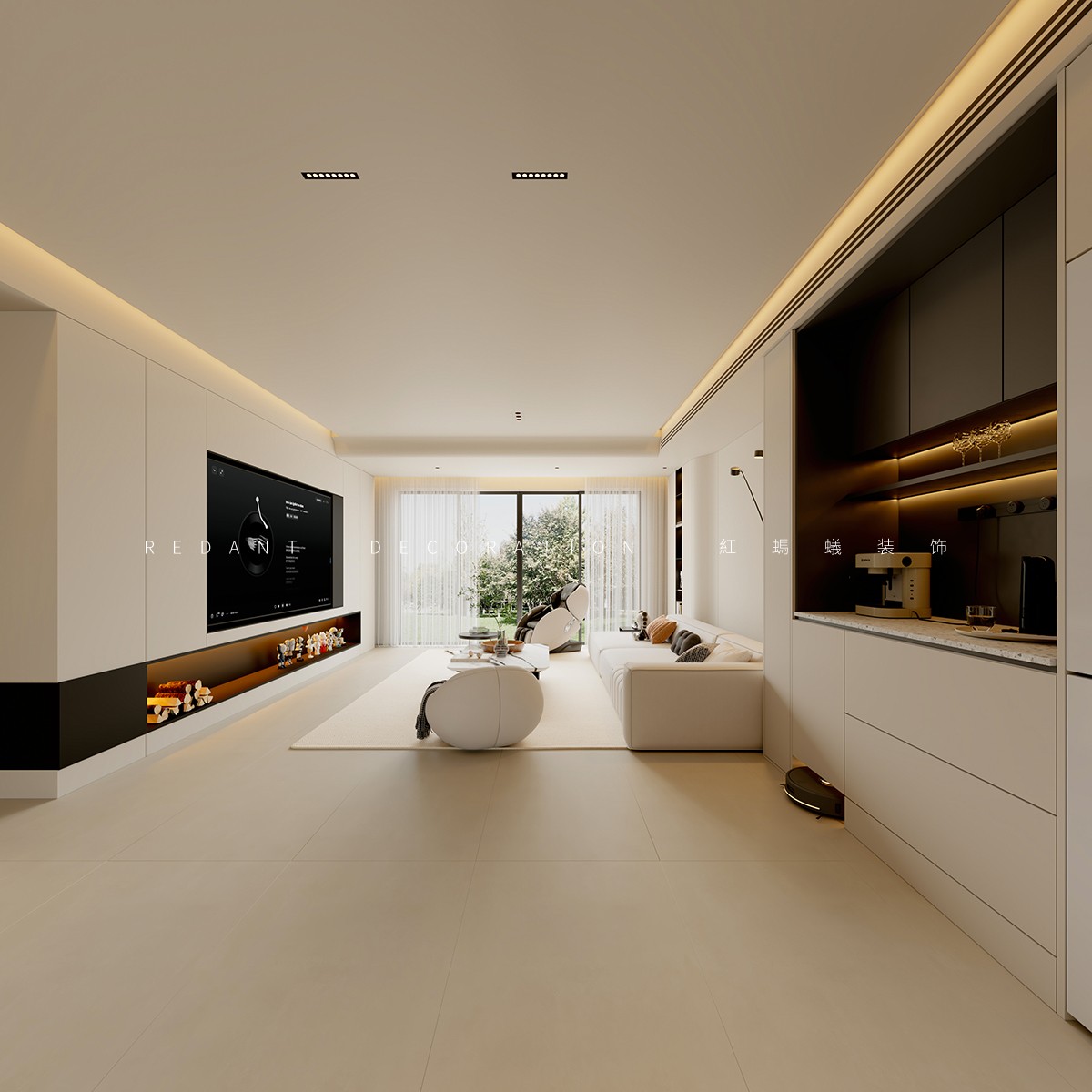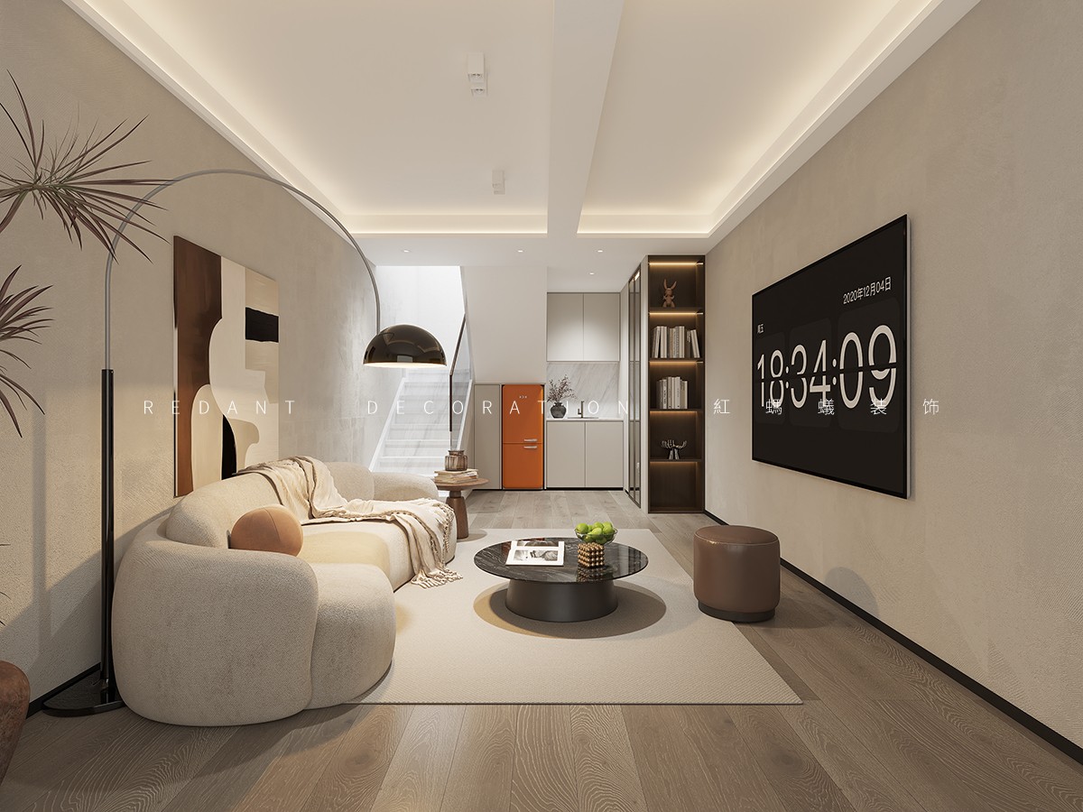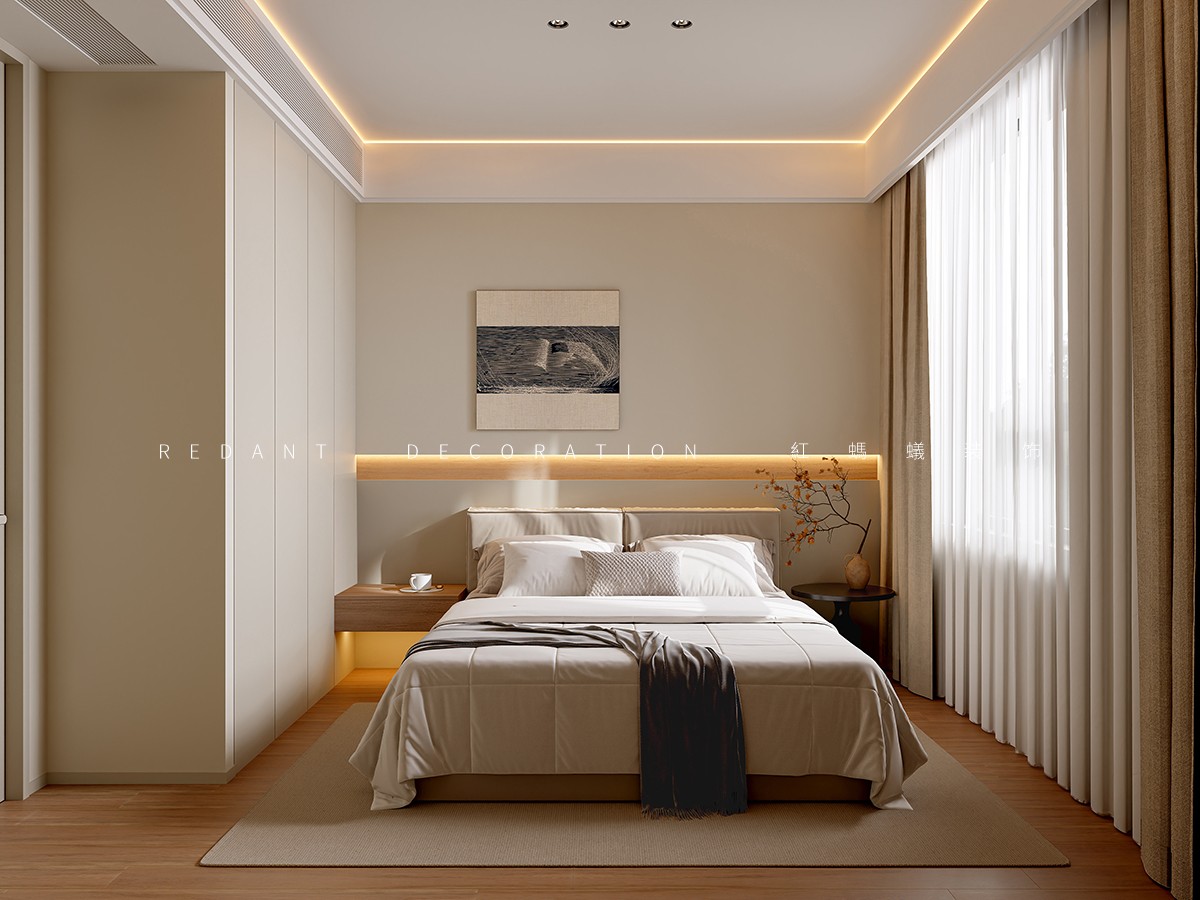 本项目以现代风格为核心,以米白、浅灰、深棕为主色调,暖金色灯光点缀,打造高级静谧的居住空间。客餐厅采用开放式一体化设计,借大面积落地窗引入自然光;卧室以材质色彩过渡营造私密休憩氛围。材质上运用哑光烤漆、微水泥等,局部点缀深色木饰面与金属线条。照明采用无主灯设计,公共区明亮开阔,卧室柔和温馨。通过定制收纳整合功能,以纯粹线条、材质与光影构建空间,打造简约舒适的理想居所。