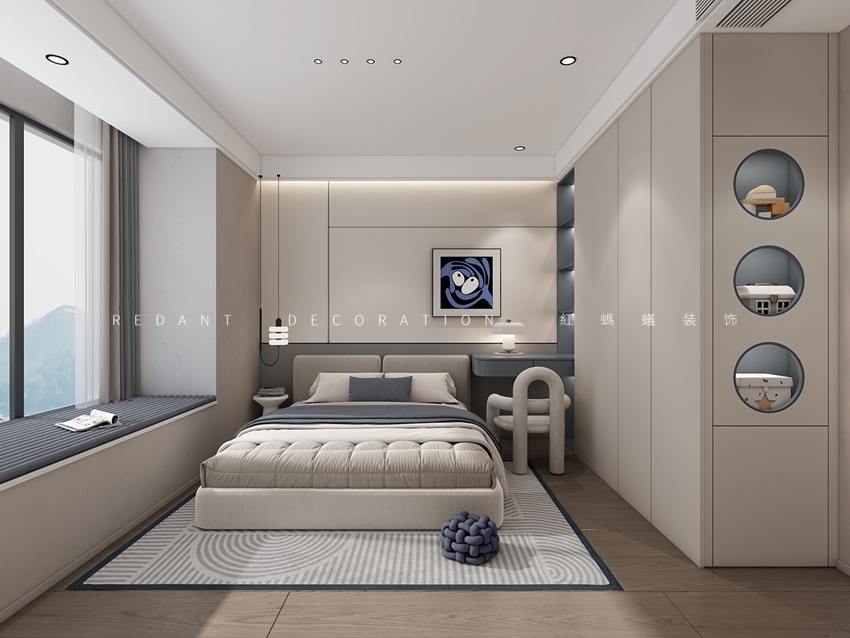 本方案以现代主义为核心,以浅米白、深炭灰的色彩对比,搭配微水泥、木饰面等材质,打造兼具秩序感与温度感的居住空间。餐厨区以深炭灰橱柜配白色台面,红色吊灯作焦点,长虹玻璃移门实现空间互动;客厅以浅米色沙发为核心,深绿大理石茶几、艺术挂画营造松弛高级氛围;卧室以一体化背景墙、通顶柜优化空间,浅灰床品、原木地板弱化冷感,全景窗引入城市景观。设计以动线、质感、功能为核心,融合秩序美学与松弛舒适,提升居住品质。