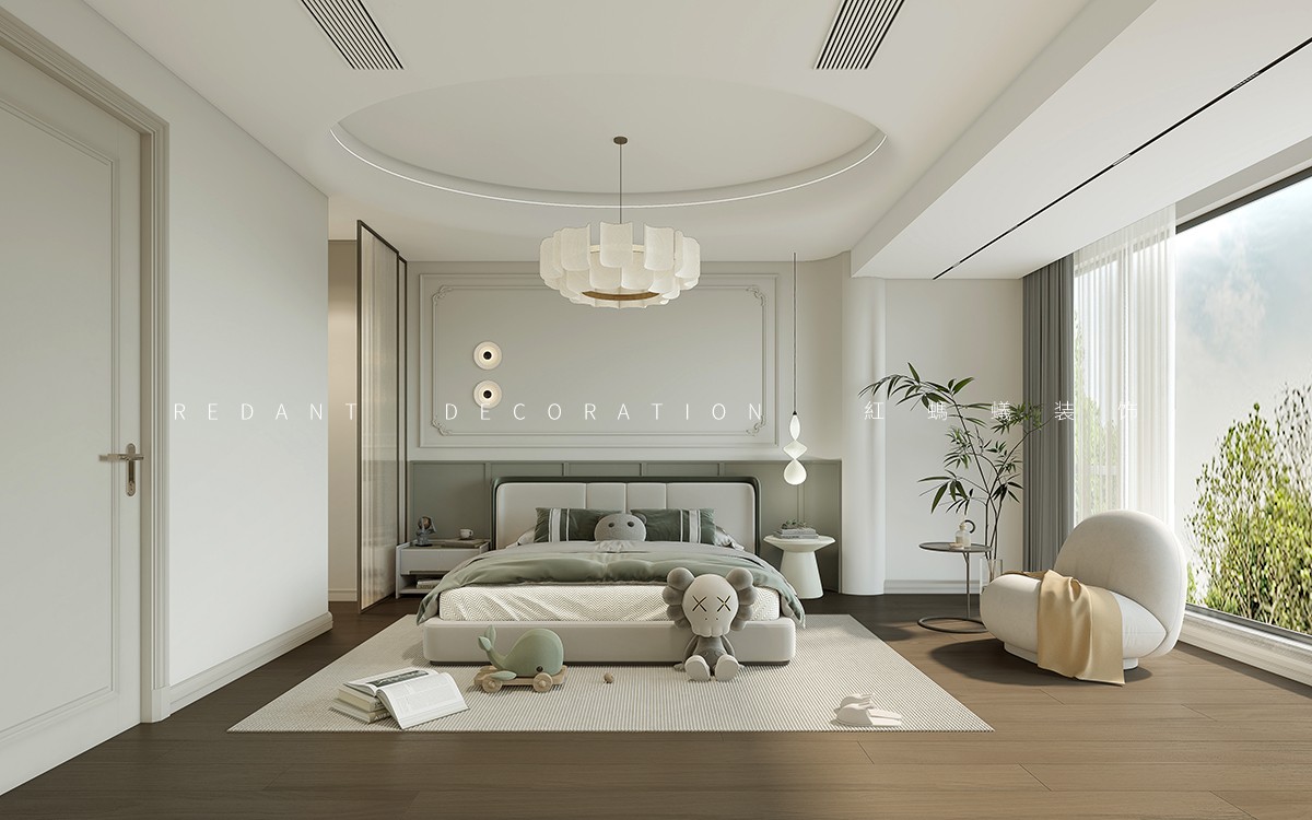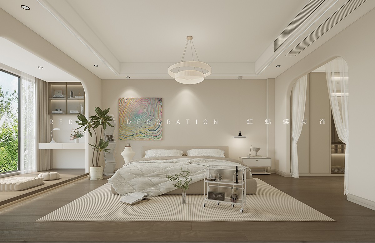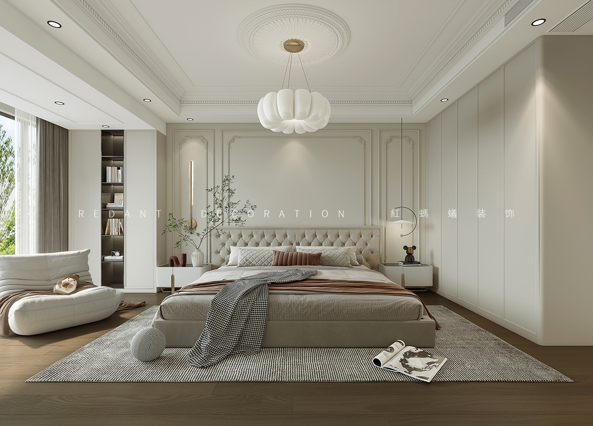 本方案以米白、奶咖色为基调,搭配原木材质与精致肌理,打造兼具浪漫仪式感与松弛治愈感的卧室空间。主卧一以石膏线吊顶、雕花软包床头复刻法式优雅,奶白花瓣吊灯与暖光壁灯柔化空间,通顶收纳柜与开放式书架兼顾实用与通透;主卧二弱化繁复线条,以弧形门洞、圆角柜体营造柔和边界,奶咖色墙面搭配艺术挂画,全景窗引绿意入室,原木地板与棉麻地毯增添温度。整套设计以色彩、材质与软装的精细化搭配,实现颜值与实用性的双重平衡。