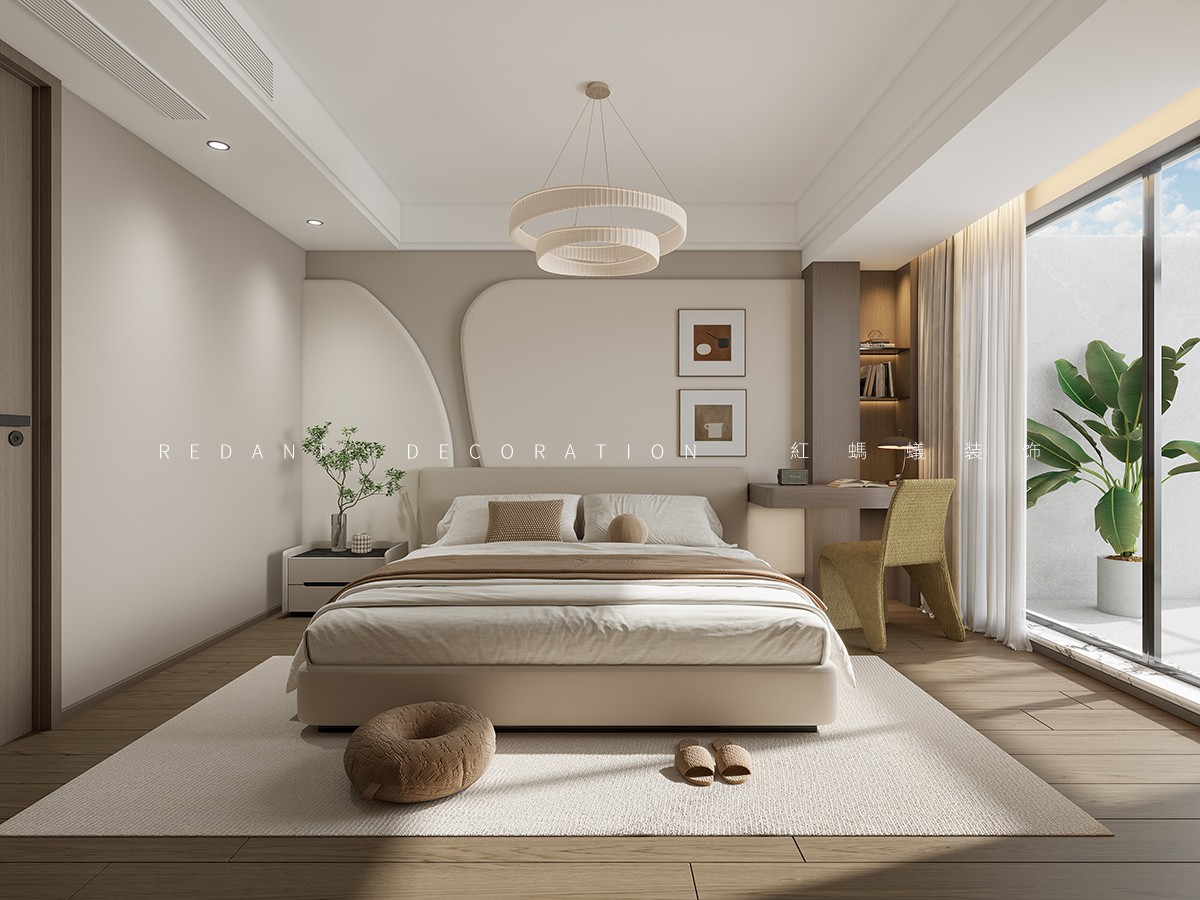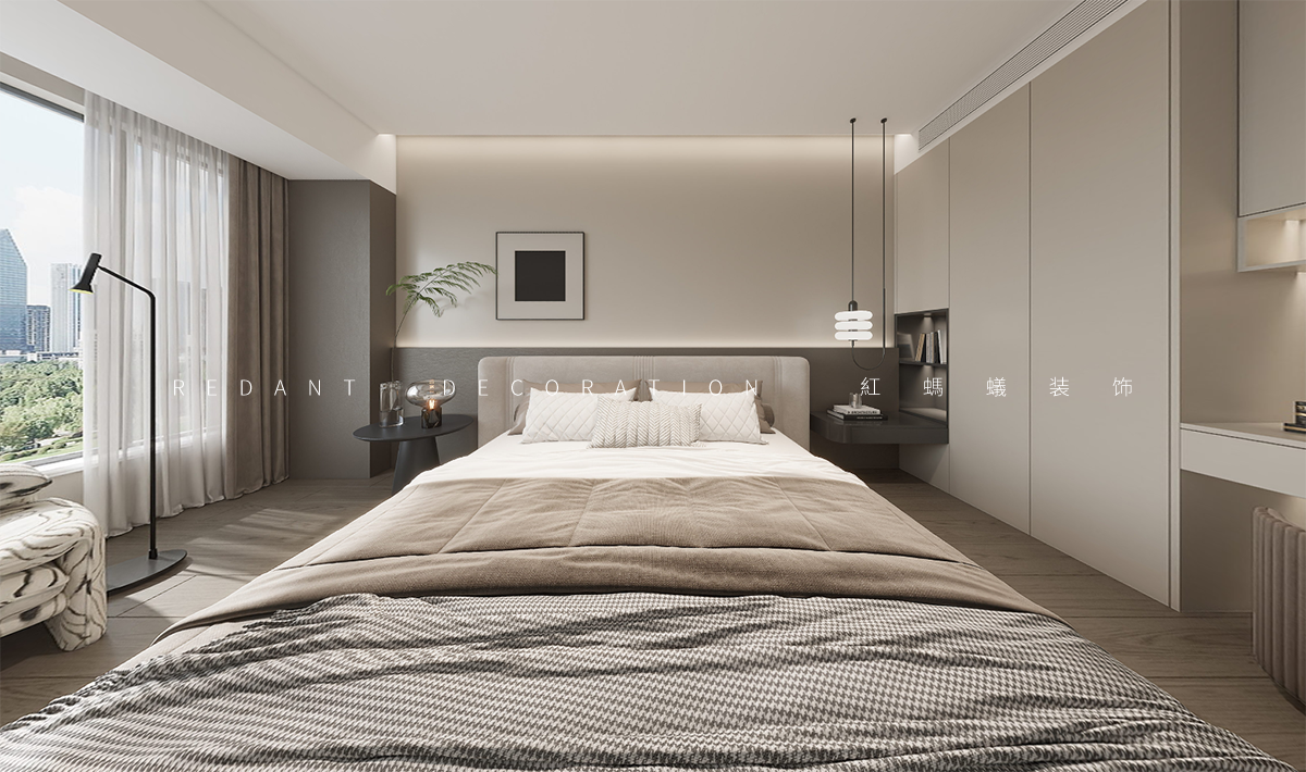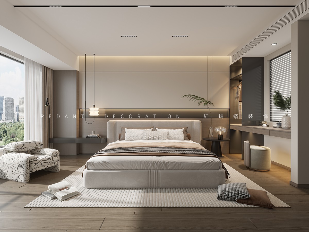 本项目以“极简克制・质感共生”为核心理念,采用深灰、米白为基底,搭配浅咖软饰、原木纹理及金属、玻璃细节,弱化厚重感,注入松弛质感。一层LDK一体化布局,弧形吊顶与灯带延伸视觉,深灰皮质沙发配不规则石质茶几,壁炉与悬浮电视墙为核心,玻璃楼梯与隐形门优化动线;地面通铺浅灰哑光大理石,墙面米白乳胶漆拼接深灰木饰面,无主灯加线性灯带营造温馨氛围。